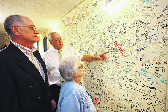 Pastor Earl Schafer gives visitors a tour of the Newberry Opera House’s wall of signatures from the last 22 seasons.
