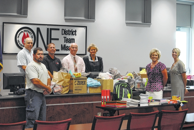 The Newberry Electric Cooperative donated school supplies that were donated during their recent Shred Day event. Front row are Jarrett Waites from Newberry Electric Cooperative, Kelly Ringer, an administrative assistant with Office of Instruction and Dr. Lynn Cary. Back row are Stuart Smith from Smith Cleaning, Gregg Shealy from Shred 360, Superintendent Jim Suber and Debra Shaw from Newberry Electric Cooperative.