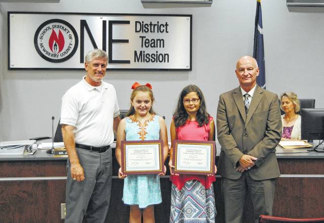 Arial Kennedy and Ava Grace Long were recognized for their achievements with SC Economics. They are pictured with Boardmember High Gray (left) and Superintendent Jim Suber (right).