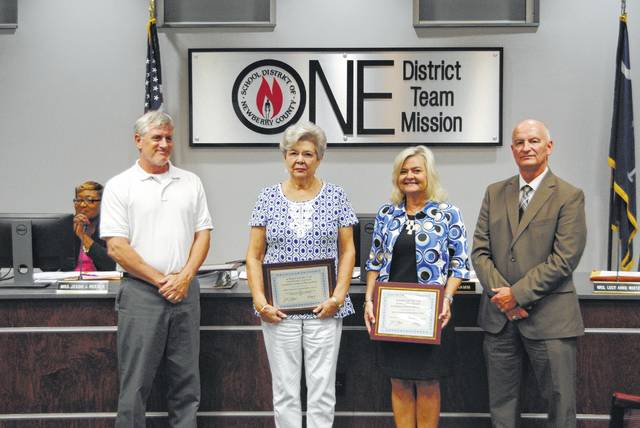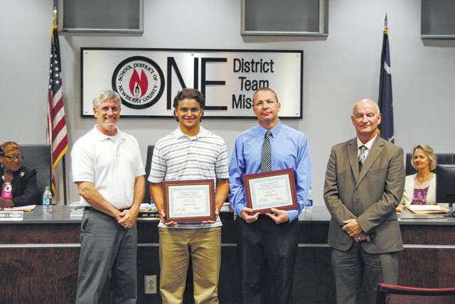 Austin Chase McCarley and Coach Chris Martin were recognized for being selected to the North/South baseball game. McCarley was selected to play, and Martin was selected to coach. They are pictured with Boardmember High Gray (left) and Superintendent Jim Suber (right).
