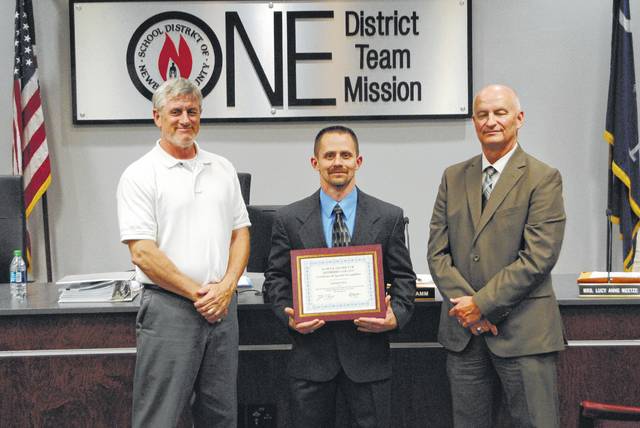 Jarrod King (center) was recognized for being named Class A Strength Coach of the Year. He is pictured with Boardmember High Gray (left) and Superintendent Jim Suber (right).