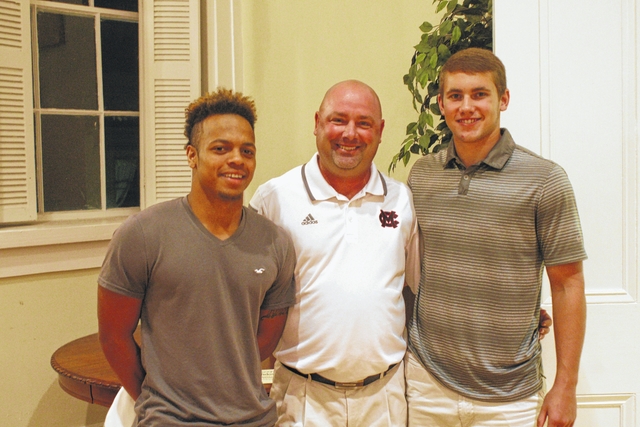 Mid-Carolina High School football coach Louie Alexander is shown with Kyzer Fulmer and Rashon Graham. Fulmer was recognized as offensive player of the month and Graham was recognized as defensive player of the month. Christian Benitez, not pictured, was recognized as special teams player of the month.