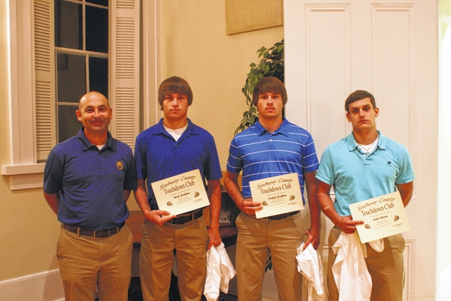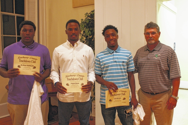 Newberry High School football coach Phil Strickland, far right, is shown with Yafari Werts, Ja Ceree Caldwell and Tyjil Brown. Werts was honored as offensive player of the month, with Caldwell honored for defensive player of the month. Brown was honored from special teams.