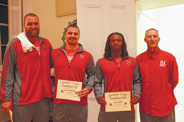 Newberry College football coach Todd Knight, far right, is shown with players Landon Martin, Taylor McDonnel and Kevin Miller. Martin was honored as the offensive player of the month with McDonnel recognized for defensive player of the month and Miller for special teams.