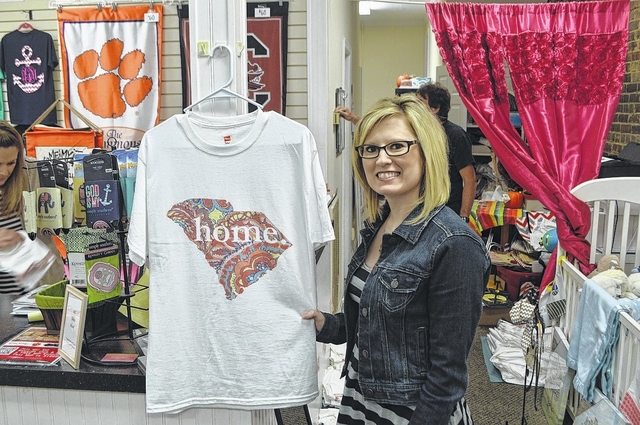 Making It Personal owner Dawn Barber shows off one one of her charity T-shirts. The T-shirts are $20 each with all profits going to the American Red Cross to support flood-relief efforts. Making It Personal has already raised $1,500.