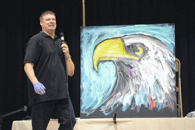 Kick or not, Glenn did not come to move educators or inspire them with his feet. Rather, he used his paintbrush and connected life to art. The Minnesota native painted as he talked until his canvas became an Eagle. Glenn chose this symbol of an observant animal with keen eyes who responds to trouble by changing altitude. He reminded, as NCSD Superintendent Jim Suber often does, of how, “your attitude determines your altitude.”