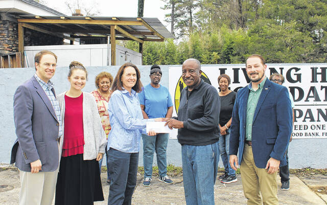 Representatives of Southern Mutual Church Insurance Co. present a check to John Glasgow, executive director of The Living Hope Foundation on Wednesday, April 6. Pictured front row: left to right Matthew Quintin, Amelia Quinton, Bonnie Knox of Southern Mutual, John Glasgow (Living Hope) and David Weiss of Southern Mutual. Back row volunteers of Living Hope: Lillie Bates, Frances Nelson, Gloria Glasgow and Ernestine Ratliffe.