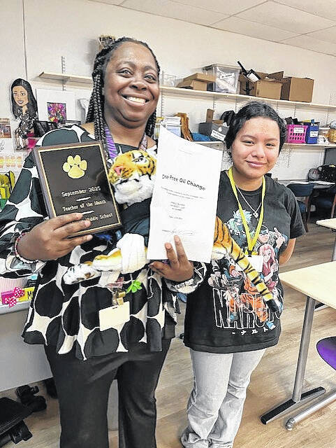 Tamara Cannon, left, was named the September Teacher of the Month. Cannon is pictured with Newberry Middle School student Adileny Gomez.