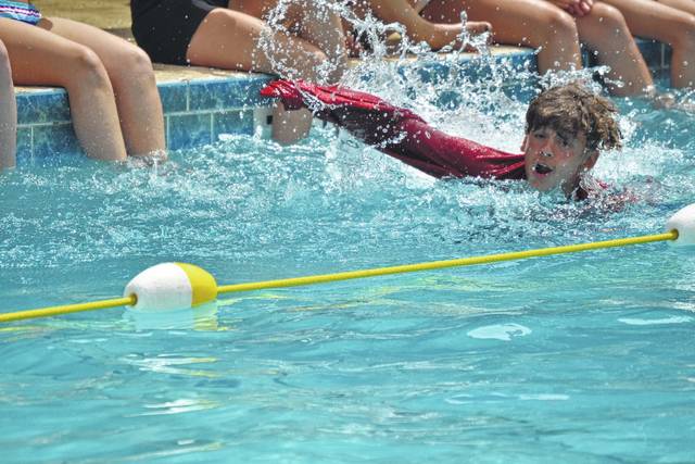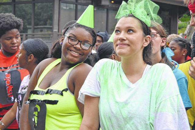 Tristin Goings of Newberry High School takes part in the sweatshirt relay as part of the “Water Bonanza.”