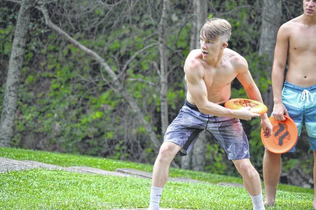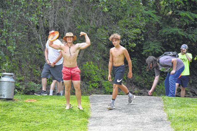 Gabe Harmon, a senior at Newberry High School, and Tristin Goings from Newberry High School play Frrisbee golf with a group.