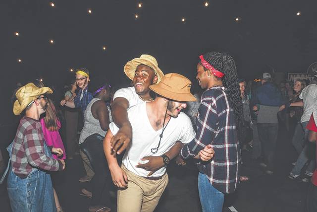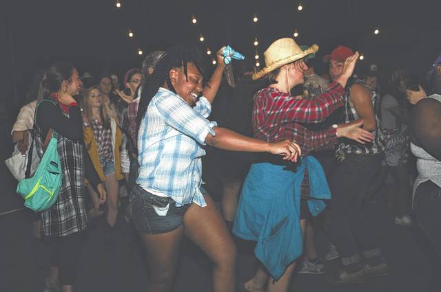 Amir Cromer, Gabe Harmon, and Lydia Kinard, all seniors at Newberry High School, square dancing on Western night.