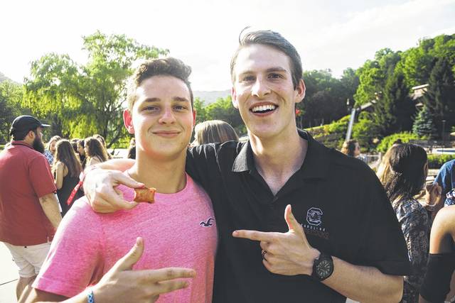 Jacob Coffey, Newberry High School junior, and Cole Harper, a staff member with Newberry County Young Life, mug for the camera.