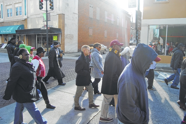 Monday’s marchers began at Bethlehem Baptist Church on College Street and marched to Caldwell Street and Miller Chapel AME.