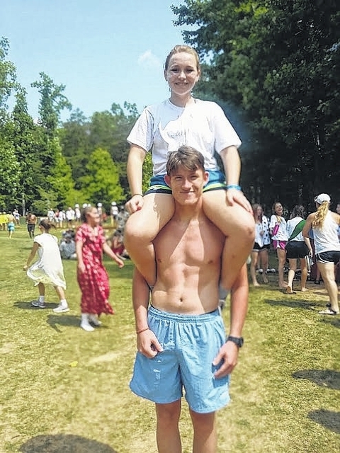 Savanna Bishop hitches a ride on Colby Berry’s shoulders to earn extra points in the all camp volleyball tournament.