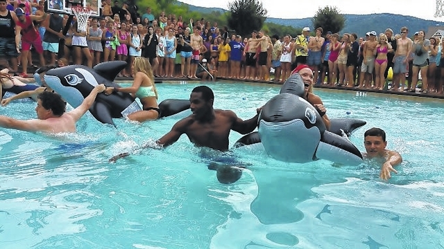Jacob Coffey, far right, helps pull his teammate in the Shamu relay portion of the 2016 Pool Olympics.