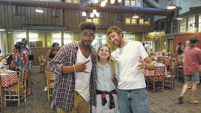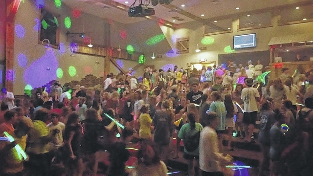 From the left, leaders Tyler Syphertt, Hannah Luther and Eddie Long prepare to welcome kids into the dining hall on Western Night — also known as the night that never ends.