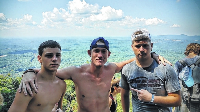 From the left, Jacob Coffey, Colby Berry and Dustin Phillips enjoy the view from the top of Sharptop Mountain.