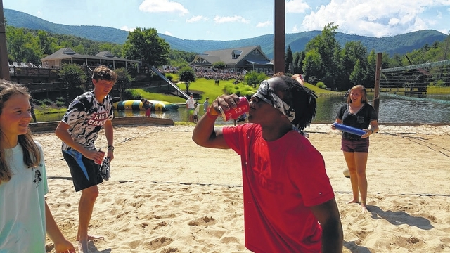 A blindfolded MyTalleek Brooks chugs a soda that his teammate guided him to as the red team competes in an all camp relay. A blindfolded MyTalleek Brooks chugs a soda that his teammate guided him to as the red team competes in an all camp relay.