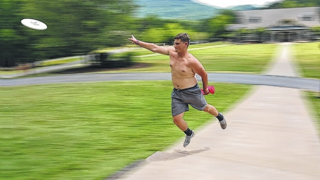 Dustin Phillips tees off during his round of Frisbee golf, which was played at Sharptop’s 18-hole course.