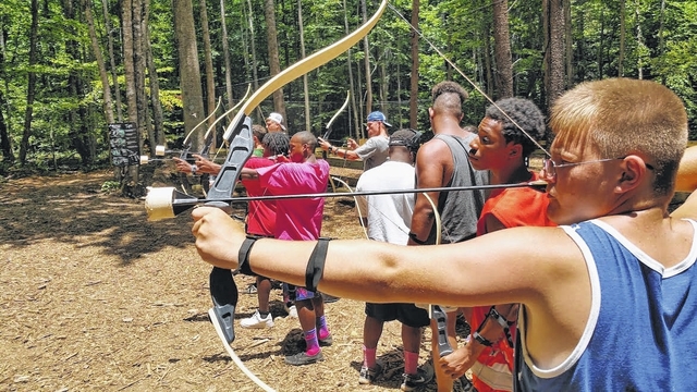 Matt Scott warms up with target practice before the cabin splits into teams for an epic game of archery tag.